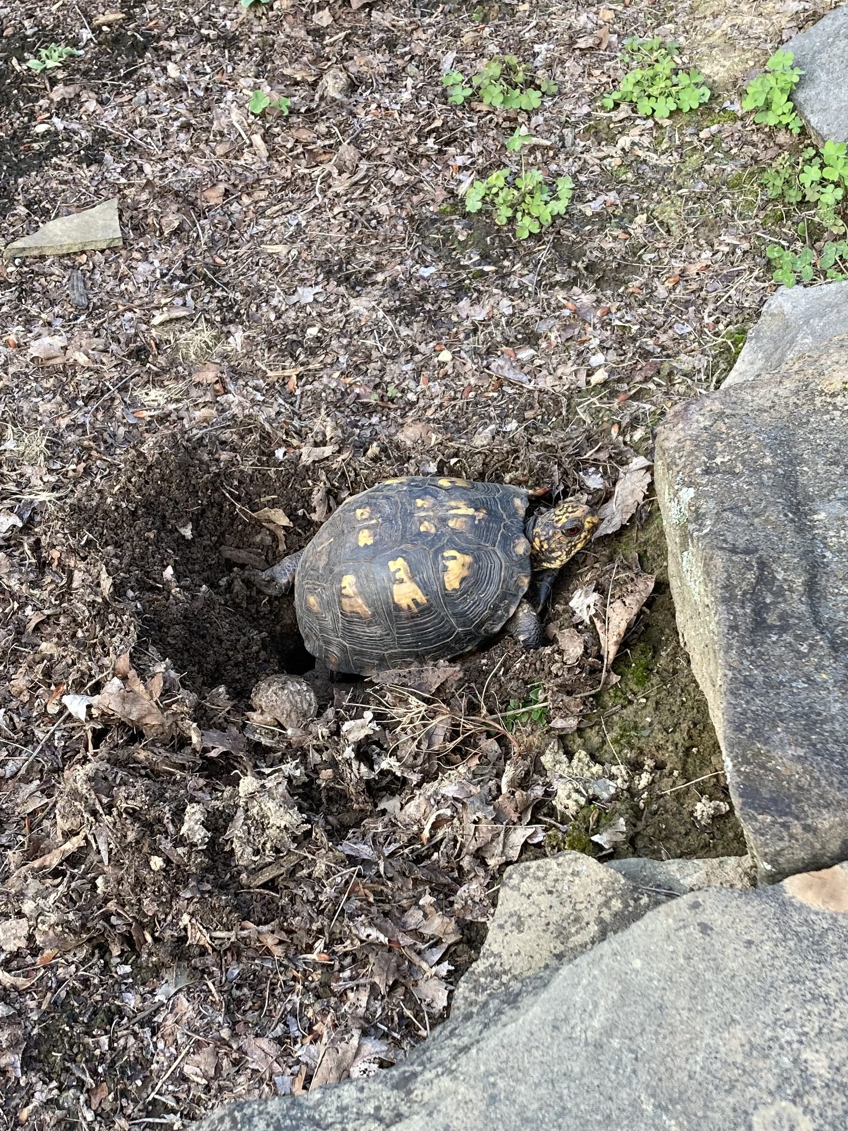 Just after sunset yesterday, I found Ernestina in an empty patch of soil where I usually plant basil (haven’t gotten around to that yet). I missed her usual appearance last year so was glad to see her alive and well. I didn’t hang around long, she’s not crazy about people. When I checked on her later, I noticed something was different from all the other times I had come across her, usually looking annoyed or head-down, Greta Garbo-like in a shallow burrow of leaves, pine needles, or soil in the vegetable garden. This time she had dug several inches into the soft soil and her butt was in the deep end and her head and front legs were on the surface. She was making a slow rocking motion, and her back legs were pushing soil around. She did not draw her head and legs into her shell as she usually does when we meet. Clearly, eggs were happening!
