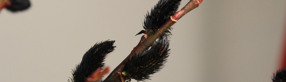 For much of the year the black pussy willow is an unremarkable plant, save for its size. But as winter drags on and spring seems distant, I am always astonished when the glistening black catkins emerge amidst the unsettled throes of late winter. I clip a few of the red-tipped stems to bring inside so I can closely watch the black fuzzy flowers open further. Some are capped with shiny maroon bud scales that eventually litter the table, along with yellow pollen that dusts the tips of the shaggy flowers. Soon I will sweep up the mess and drop the spent twigs into the compost pile as the daffodils finally dare to bloom.